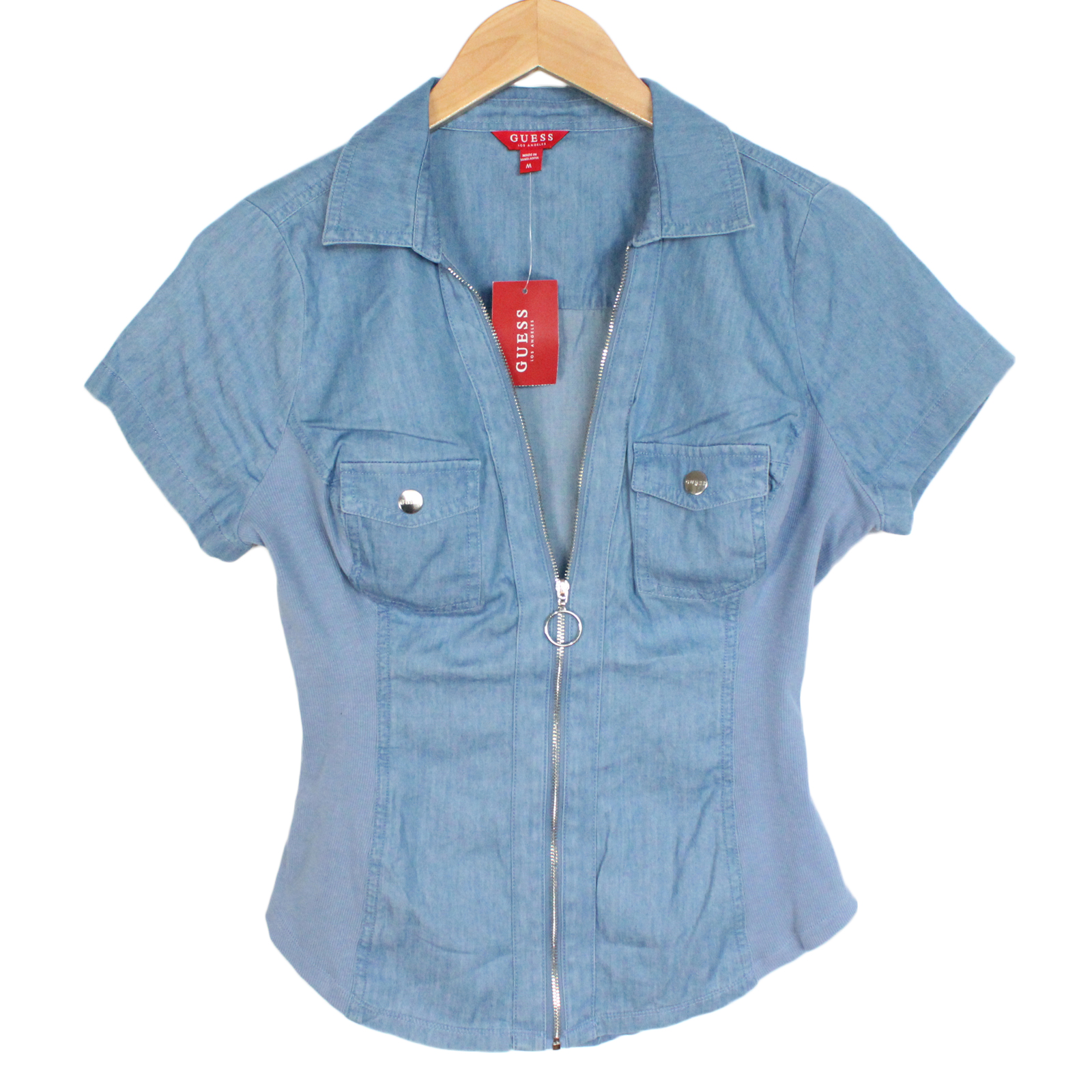 GUESS Palmer Cotton Blend Zip-Front Short Sleeve Blue Top